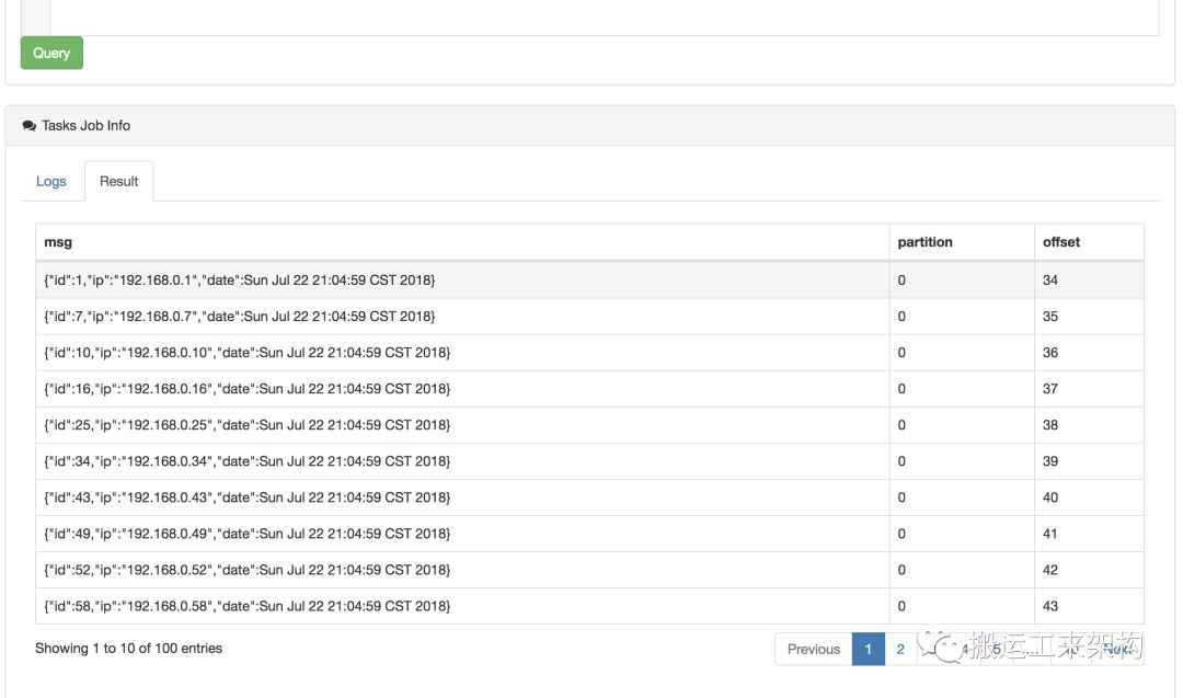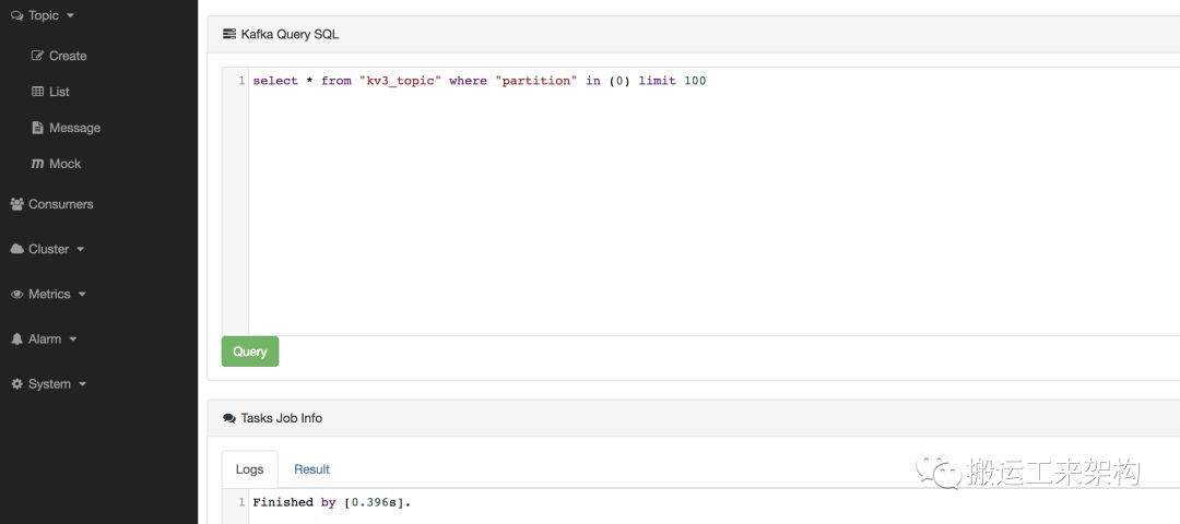 在排除一些主观因素后,回到Kafka Eagle系统应用层面,如果出现这种问题,可以尝试开启属性kafka.eagle.sql.fix.error=true,这个属性默认是不开启的。正常情况下使用Kafka SQL查询Topic,返回结果如下图所示: