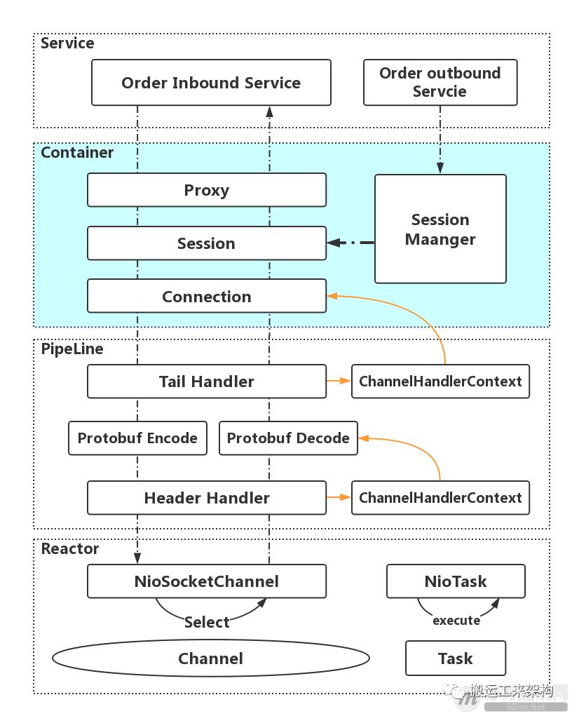 1、引言京东的京麦商家后台2014年构建网关,从HTTP网关发展到TCP网关。在2016年重构完成基于Netty4.x+Protobuf3.x实现对接PC和App上下行通信的高可用、高性能、高稳定的TCP长连接网关。 早期京麦搭建HTTP和TCP长连接功能主要用于消息通知的推送,并未应用于API网关。随着逐步对NIO的深入学习和对Netty框架的了解,以及对系统通信稳定能力的愈加高要求,采用NIO技术应用网关实现API请求调用的想法,最终在2016年实现,并完全支撑业务化运行。由于诸多的改进,包括TCP长连接容器、Protobuf的序列化、服务泛化调用框架等等,性能比HTTP网关提升10倍以上,稳定性也远远高于HTTP网关。 本文重点介绍京麦TCP网关的技术架构及Netty的应用实践。 简单介绍一下京麦是什么: 京麦工作台是京东商城为京东的商家准备的一款后台管理工具,它可以使您不登陆商家后台就能进行订单生产,快速实现订单下载发货流程。类似于淘宝的旺旺商家版(现在叫淘宝千牛)这样的东西。 2、本文作者![]() - 京东商家研发部架构师; - 丰富的构建高性能高可用大规模分布式系统的研发、架构经验; - 2013年加入京东,目前负责京麦服务网关和京麦服务市场的系统研发工作。 3、TCP网关的网络结构基于Netty构建京麦TCP网关的长连接容器,作为网关接入层提供服务API请求调用。 客户端通过域名+端口访问TCP网关,域名不同的运营商对应不同的VIP,VIP发布在LVS上,LVS将请求转发给后端的HAProxy,再由HAProxy把请求转发给后端的Netty的IP+Port。 LVS转发给后端的HAProxy,请求经过LVS,但是响应是HAProxy直接反馈给客户端的,这也就是LVS的DR模式。 4、TCP网关长连接容器架构TCP网关的核心组件是Netty,而Netty的NIO模型是Reactor反应堆模型(Reactor相当于有分发功能的多路复用器Selector)。每一个连接对应一个Channel(多路指多个Channel,复用指多个连接复用了一个线程或少量线程,在Netty指EventLoop),一个Channel对应唯一的ChannelPipeline,多个Handler串行的加入到Pipeline中,每个Handler关联唯一的ChannelHandlerContext。 TCP网关长连接容器的Handler就是放在Pipeline的中。我们知道TCP属于OSI的传输层,所以建立Session管理机制构建会话层来提供应用层服务,可以极大的降低系统复杂度。所以,每一个Channel对应一个Connection,一个Connection又对应一个Session,Session由Session Manager管理,Session与Connection是一一对应,Connection保存着ChannelHandlerContext(ChannelHanderContext可以找到Channel),Session通过心跳机制来保持Channel的Active状态。 每一次Session的会话请求(ChannelRead)都是通过Proxy代理机制调用Service层,数据请求完毕后通过写入ChannelHandlerConext再传送到Channel中。数据下行主动推送也是如此,通过Session Manager找到Active的Session,轮询写入Session中的ChannelHandlerContext,就可以实现广播或点对点的数据推送逻辑。如下图所示。 京麦TCP网关使用Netty Channel进行数据通信,使用Protobuf进行序列化和反序列化,每个请求都将被封装成Byte二进制字节流,在整个生命周期中,Channel保持长连接,而不是每次调用都重新创建Channel,达到链接的复用。 我们接下来来看看基于Netty的具体技术实践。 5、TCP网关Netty Server的IO模型具体的实现过程如下: