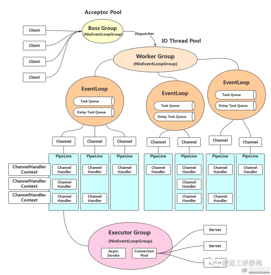 6、TCP网关的线程模型TCP网关使用Netty的线程池,共三组线程池,分别为BossGroup、WorkerGroup和ExecutorGroup。其中,BossGroup用于接收客户端的TCP连接,WorkerGroup用于处理I/O、执行系统Task和定时任务,ExecutorGroup用于处理网关业务加解密、限流、路由,及将请求转发给后端的抓取服务等业务操作。 ![]() NioEventLoop是Netty的Reactor线程,其角色: