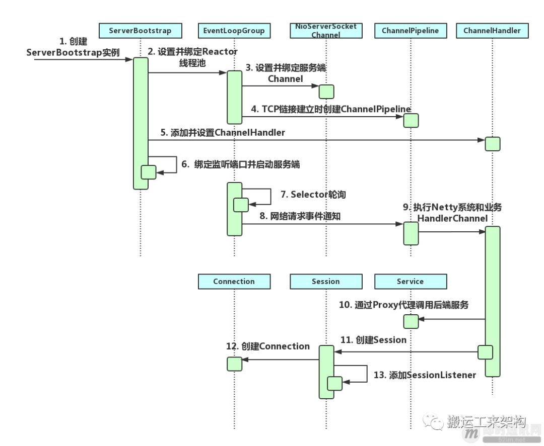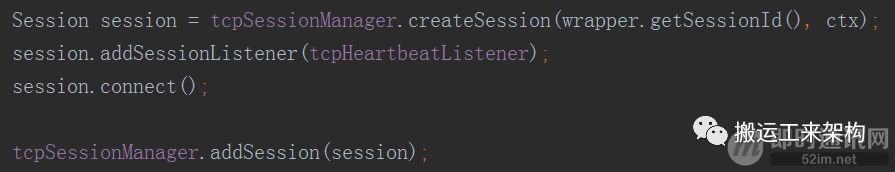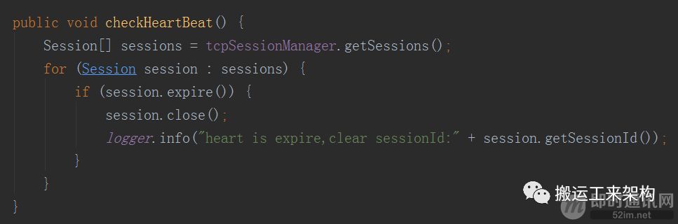 7、TCP网关执行时序图![]() 如上图所示,其中步骤一至步骤九是Netty服务端的创建时序,步骤十至步骤十三是TCP网关容器创建的时序。 步骤一:创建ServerBootstrap实例,ServerBootstrap是Netty服务端的启动辅助类。 步骤二:设置并绑定Reactor线程池,EventLoopGroup是Netty的Reactor线程池,EventLoop负责所有注册到本线程的Channel。 步骤三:设置并绑定服务器Channel,Netty Server需要创建NioServerSocketChannel对象。 步骤四:TCP链接建立时创建ChannelPipeline,ChannelPipeline本质上是一个负责和执行ChannelHandler的职责链。 步骤五:添加并设置ChannelHandler,ChannelHandler串行的加入ChannelPipeline中。 步骤六:绑定监听端口并启动服务端,将NioServerSocketChannel注册到Selector上。 步骤七:Selector轮训,由EventLoop负责调度和执行Selector轮询操作。 步骤八:执行网络请求事件通知,轮询准备就绪的Channel,由EventLoop执行ChannelPipeline。 步骤九:执行Netty系统和业务ChannelHandler,依次调度并执行ChannelPipeline的ChannelHandler。 步骤十:通过Proxy代理调用后端服务,ChannelRead事件后,通过发射调度后端Service。 步骤十一:创建Session,Session与Connection是相互依赖关系。 步骤十二:创建Connection,Connection保存ChannelHandlerContext。 步骤十三:添加SessionListener,SessionListener监听SessionCreate和SessionDestory等事件。 8、TCP网关源码分析8.1Session管理Session是客户端与服务端建立的一次会话链接,会话信息中保存着SessionId、连接创建时间、上次访问事件,以及Connection和SessionListener,在Connection中保存了Netty的ChannelHandlerContext上下文信息。Session会话信息会保存在SessionManager内存管理器中。 创建Session的源码: ![]() 通过源码分析,如果Session已经存在销毁Session,但是这个需要特别注意,创建Session一定不要创建那些断线重连的Channel,否则会出现Channel被误销毁的问题。因为如果在已经建立Connection(1)的Channel上,再建立Connection(2),进入session.close方法会将cxt关闭,Connection(1)和Connection(2)的Channel都将会被关闭。在断线之后再建立连接Connection(3),由于Session是有一定延迟,Connection(3)和Connection(1/2)不是同一个,但Channel可能是同一个。 所以,如何处理是否是断线重练的Channel,具体的方法是在Channel中存入SessionId,每次事件请求判断Channel中是否存在SessionId,如果Channel中存在SessionId则判断为断线重连的Channel,代码如下图所示。 ![]() 8.2心跳心跳是用来检测保持连接的客户端是否还存活着,客户端每间隔一段时间就会发送一次心跳包上传到服务端,服务端收到心跳之后更新Session的最后访问时间。在服务端长连接会话检测通过轮询Session集合判断最后访问时间是否过期,如果过期则关闭Session和Connection,包括将其从内存中删除,同时注销Channel等。如下图代码所示。