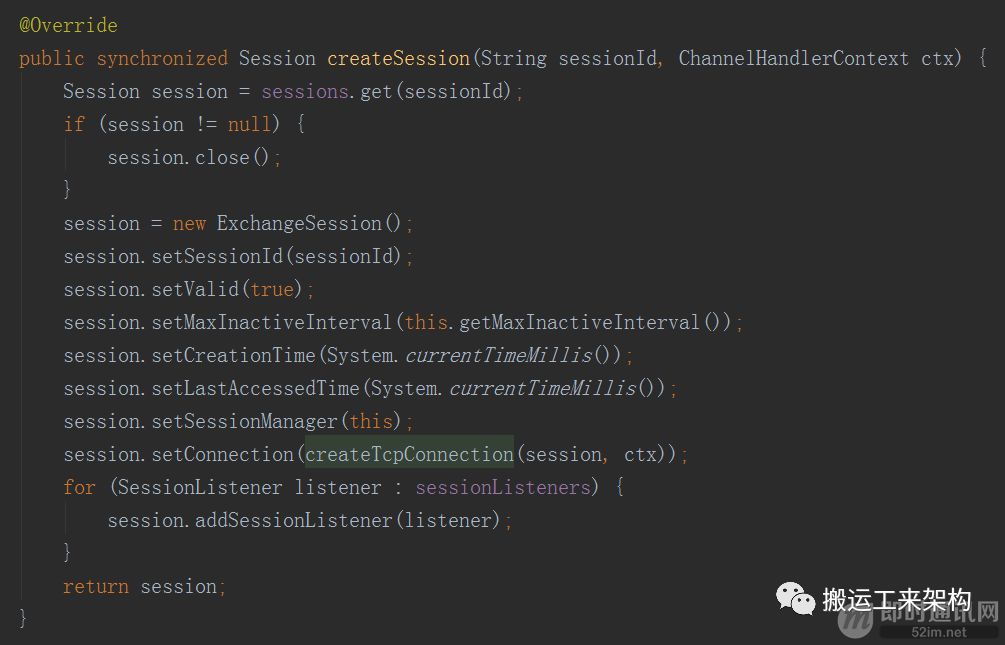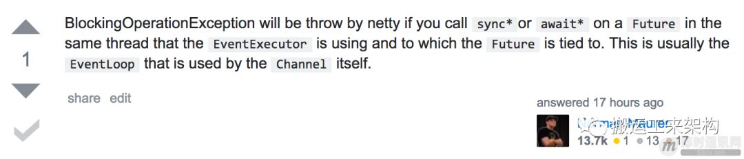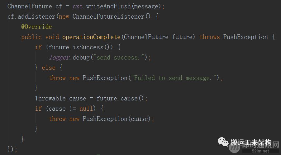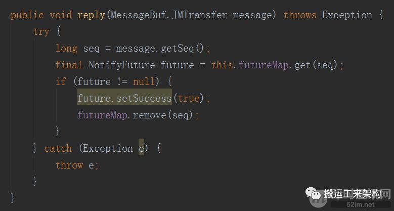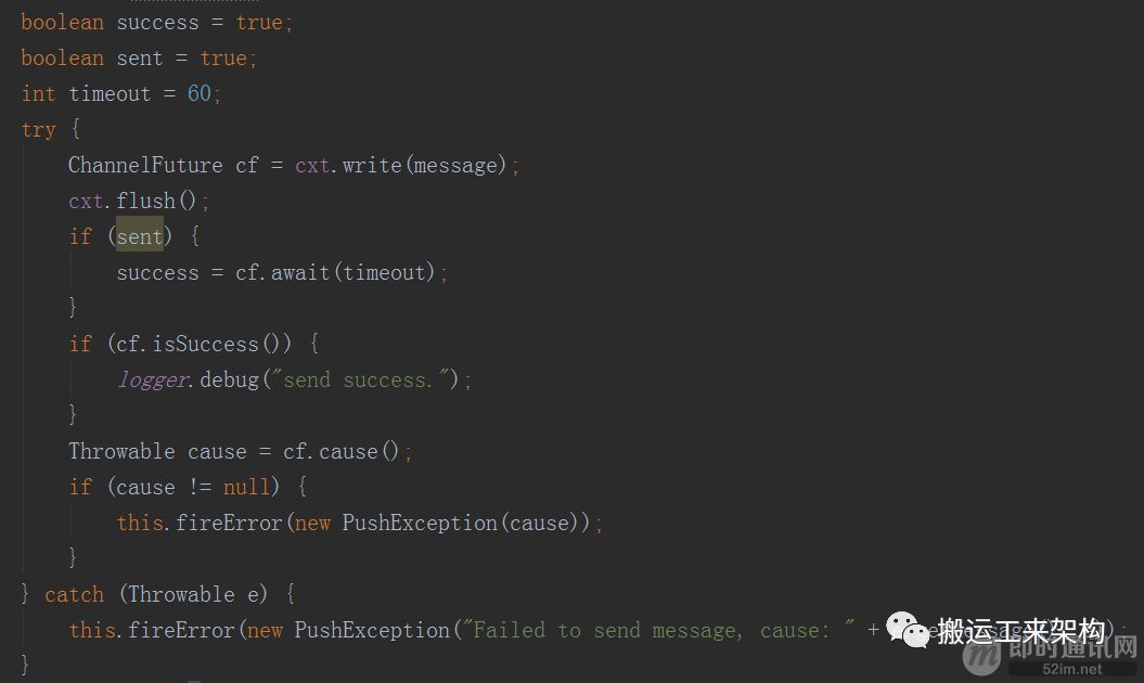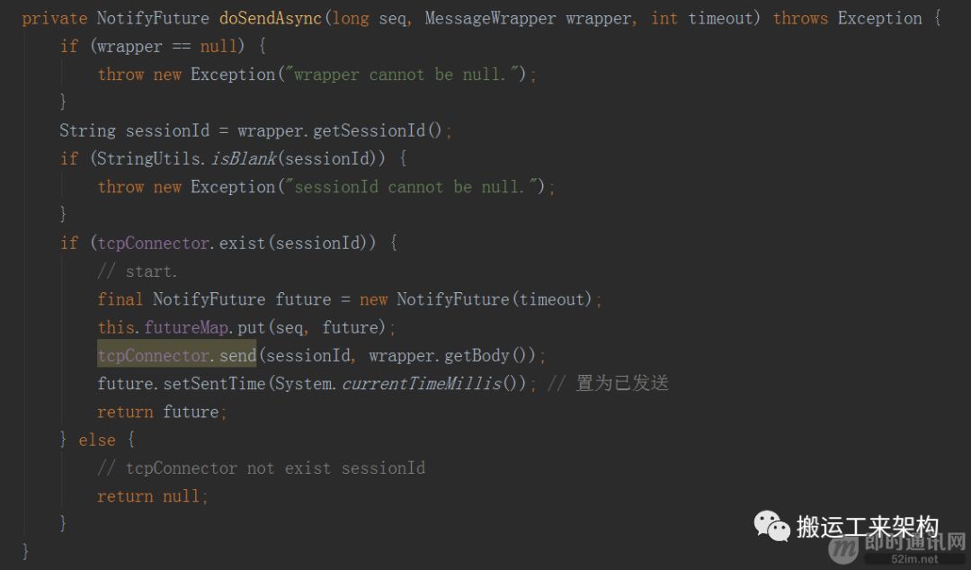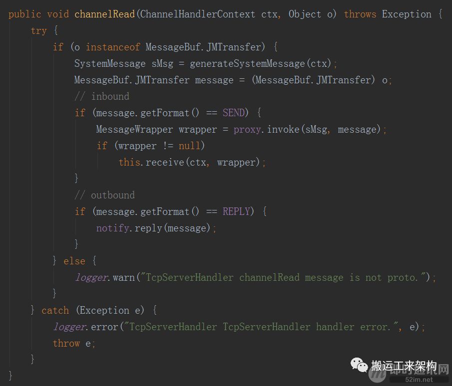 ![]() 同时,注意到session.connect方法,在connect方法中会对Session添加的Listeners进行添加时间,它会循环调用所有Listner的sessionCreated事件,其中TcpHeartbeatListener也是在这个过程中被唤起。如下图代码所示。 ![]() 8.3数据上行数据上行特指从客户端发送数据到服务端,数据从ChannelHander的channelRead方法获取数据。数据包括创建会话、发送心跳、数据请求等。这里注意的是,channelRead的数据包括客户端主动请求服务端的数据,以及服务端下行通知客户端的返回数据,所以在处理object数据时,通过数据标识区分是请求-应答,还是通知-回复。如下图代码所示。 8.4数据下行数据下行通过MQ广播机制到所有服务器,所有服务器收到消息后,获取当前服务器所持有的所有Session会话,进行数据广播下行通知。如果是点对点的数据推送下行,数据也是先广播到所有服务器,每个服务器判断推送的端是否是当前服务器持有的会话,如果判断消息数据中的信息是在当前服务,则进行推送,否则抛弃。如下图代码所示。 ![]() 通过源码分析,数据下行则通过NotifyProxy的方式发送数据,需要注意的是Netty是NIO,如果下行通知需要获取返回值,则要将异步转同步,所以NotifyFuture是实现java.util.concurrent.Future的方法,通过设置超时时间,在channelRead获取到上行数据之后,通过seq来关联NotifyFuture的方法。如下图代码所示。 下行的数据通过TcpConnector的send方法发送,send方式则是通过ChannelHandlerContext的writeAndFlush方法写入Channel,并实现数据下行,这里需要注意的是,之前有另一种写法就是cf.await,通过阻塞的方式来判断写入是否成功,这种写法偶发出现BlockingOperationException的异常。如下图代码所示。 使用阻塞获取返回值的写法: ![]() 关于BlockingOperationException的问题我在StackOverflow进行提问,非常幸运的得到了Norman Maurer(Netty的核心贡献者之一)的解答: ![]() 最终结论大致分析出,在执行write方法时,Netty会判断current thread是否就是分给该Channe的EventLoop,如果是则行线程执行IO操作,否则提交executor等待分配。当执行await方法时,会从executor里fetch出执行线程,这里就需要checkDeadLock,判断执行线程和current threads是否时同一个线程,如果是就检测为死锁抛出异常BlockingOperationException。 9、本文小结本篇文章粗浅的向大家介绍了京麦TCP网关中使用的Netty实现长连接容器的架构,涉及TCP长连接容器搭建的关键点一一进行了阐述,以及对源码进行简单的分析。在京麦发展过程里Netty还有很多的实践应用,例如Netty4.11+HTTP2实现APNs的消息推送等等。 |