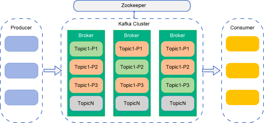 如上图的中间部分,Partition 分布于多个 Broker 上。图中绿色的模块表示 Topic1 被分为了 3 个 Partition,每个 Partition 会被复制多份存在于不同的 Broker 上,如图中红色的模块,这样可以保证主分区出现问题时进行容灾。每个 Broker 可以保存多个 Topic 的多个 Partition。