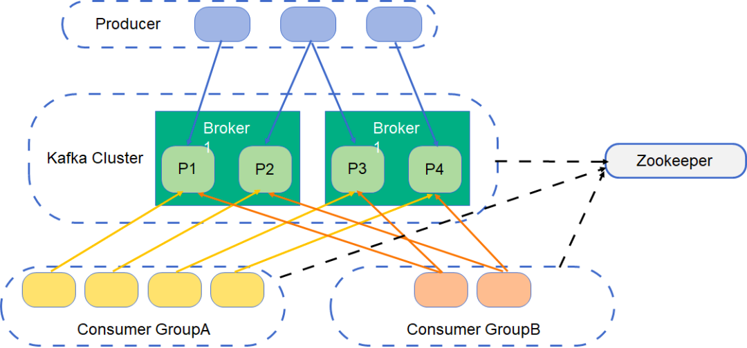 Consumer 按照 Group 来消费消息,Topic 中的每一条消息可以被多个 Consumer Group 消费,如上图中的 GroupA 和 GroupB。