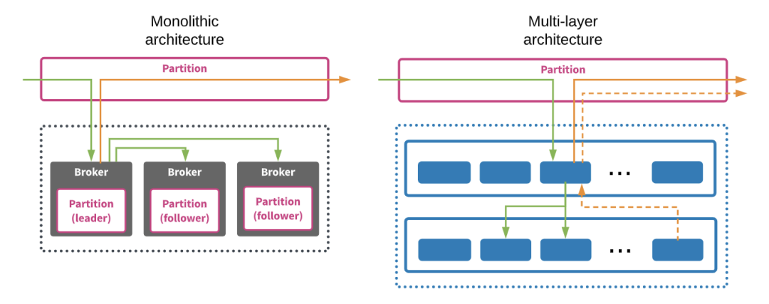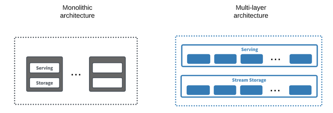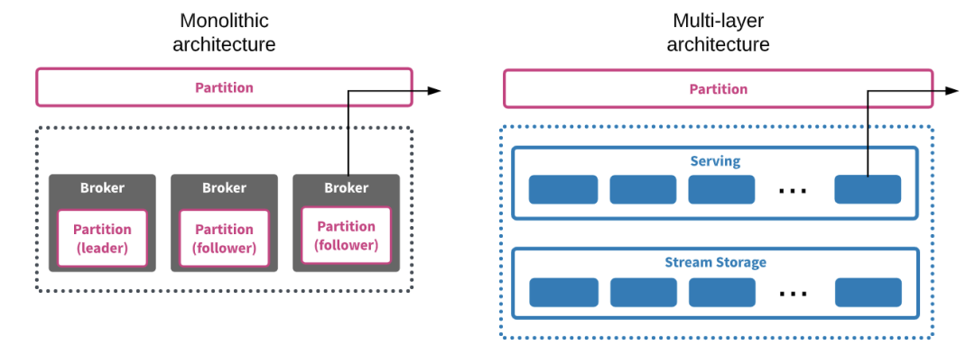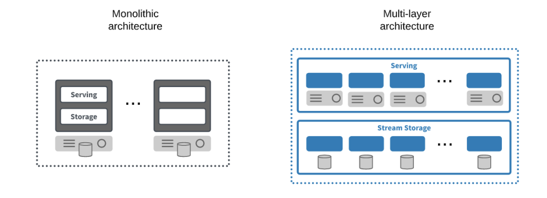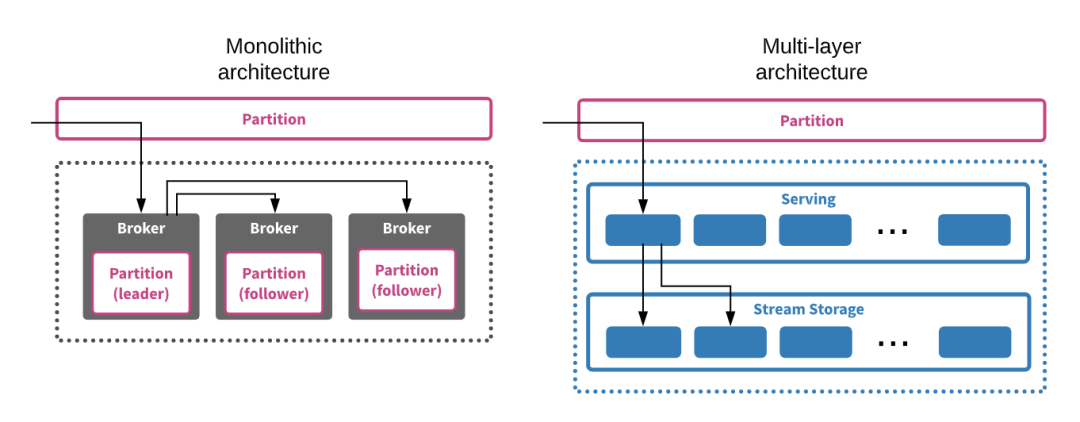 而大多数消息队列技术(包括 Apache Kafka)都采用单体架构,其消息处理和消息持久化(如果提供了的话)都在集群内的同一个节点上。这种体系结构在大多数传统的数据库平台以及 Hadoop 等大数据系统中也较为常见,与昂贵的外部存储阵列的常见替代方案相比,其设计目的在于将数据的计算与存储放到同一台机器上来处理,以减少网络流量和访问延迟,同时降低存储成本。这种方法在小型环境中很容易部署,但在性能、可伸缩性和灵活性方面存在明显问题。随着固态磁盘的广泛使用,网络带宽的迅速提升以及存储延迟的显著降低,已经没有必要采用单体架构进行这种权衡处理了。