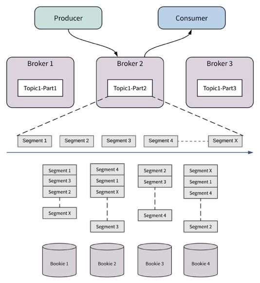 Pulsar 架构中数据服务和数据存储是单独的两层:数据服务层由无状态的 “Broker” 节点组成,而数据存储层则由 “Bookie” 节点组成。