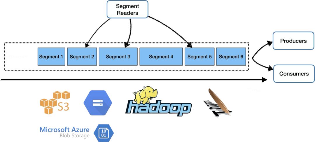 Pulsar 将无界的数据看作是分片的流,分片分散存储在分层存储(tiered storage)、BookKeeper 集群和 Broker 节点上,而对外提供一个统一的、无界数据的视图。其次,不需要用户显式迁移数据,减少存储成本并保持近似无限的存储。因此,Pulsar 不仅可以存储当前数据,还可以存储完整的历史数据。
