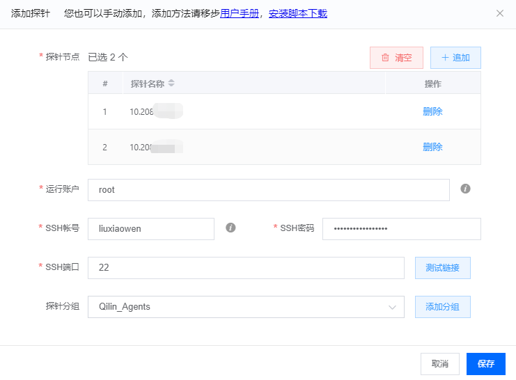 使用数据汇集实时收集服务器上的日志,需要先在服务器上安装探针。可以在界面上通过输入SSH用户名密码来安装,也可以下载安装脚本,线下手动安装。有了探针之后,可以在汇集任务页面创建任务,在画布中拖拽任务类型,通过配置即可完成。