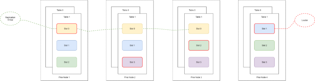 为了对数据按照业务进行隔离,Pika集群引入table的概念,不同的业务数据存储在不同的table中。业务数据按照key的hash值存储到对应的slot上面。每一个slot会有多个副本,从而形成一个replication group。replication group中的所有slot副本具有相同的slot ID,其中一个slot副本是leader,其他副本为follower。为了保证数据的一致性,只有leader提供读写服务。可以使用pika manager可以对slot进行调度迁移,使数据和读写压力均匀的分散到整个pika集群中,从而保证了整个集群资源的充分利用并且可以根据业务压力和存储容量的需要进行水平扩容和缩容。
