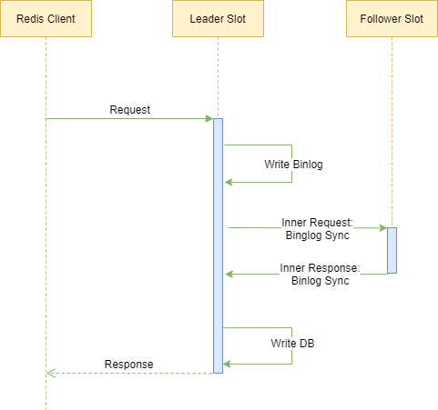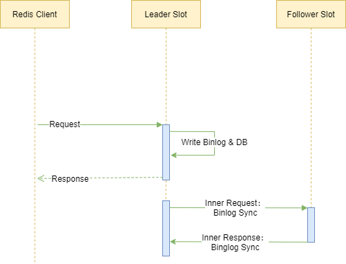 处理线程接收到客户端的请求,直接加锁后写入binlog和并操作db。 处理线程返回客户端response。 辅助线程发送BinlogSync同步请求给follower slot,同步日志。 follower slot返回BinlogSyncAck报告同步情况。