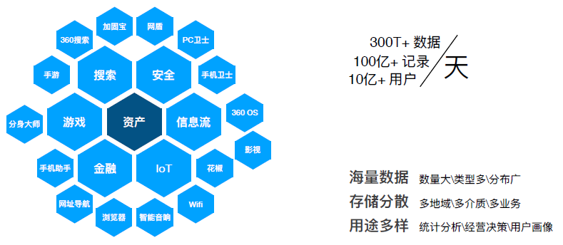 从图中可以看到,公司内业务方向主要分为搜索、安全、视频信息流、游戏、金融和 IoT 六个领域,以这些领域为核心由向外衍生出诸多产品,这些产品每日新增打点数据 300T+,换算后有接近 100 亿 + 条记录,覆盖用户数达到 10 亿 +。由于业务对数据的使用场景在时延和量级上有不同的需求,所以数据往往分散存储在诸多存储介质上,在进行数据产出时需要抽取合并不同介质的数据,以公司内部场景为例: