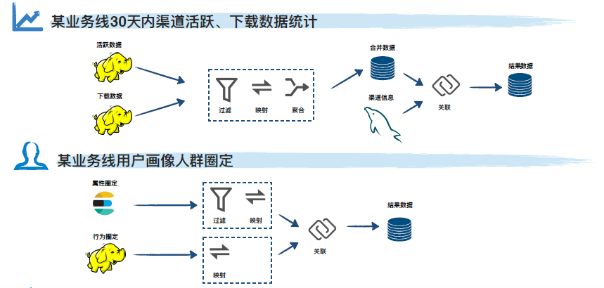 某业务线要处理一定周期内各渠道活跃、下载数据的指标,由于渠道信息数据量较小,且往往会涉及频繁增删改,这部分数据通常存放于 MySQL 中,而用户的活跃下载数据实时打点写入,最终会落地 HDFS,一旦两部分数据需要关联分析时流程通常很冗长,对于业务人员而言处理难度较高。此外,在用户画像的场景下,由于行为数据和属性数据处于异构数据源,业务人员也会面临类似的问题,导致处理数据的效能低下。
