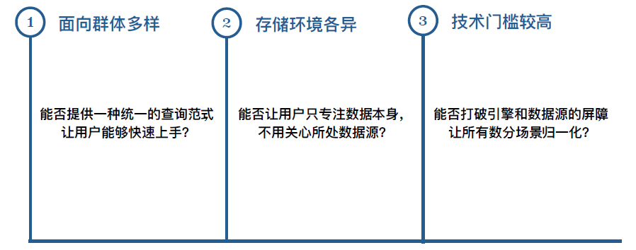 因此,我们考虑对外提供统一的查询范式,屏蔽底层数据源和操作细节,让业务人员摆脱加工数据的技术束缚,不论是对成本控制还是效率提升都是一本万利的事情。