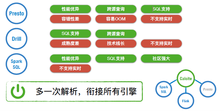 对于统一查询的场景,我们参考了业界已有的引擎,调研发现:受限于当下计算体系结构,每一种引擎都存在优劣势。面临选择的场景,我们考虑使用动态调度的思想,使用 Apache Calcite 作为上层解析器,通过多一次解析搞清楚用户的查询意图,再向对应引擎解释路由,让合适的引擎做合适的事儿。
