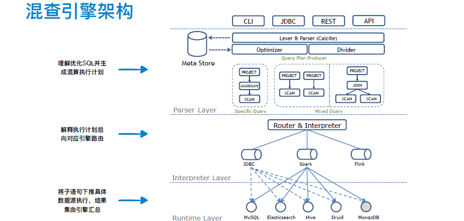解析层主要通过与元数据库交互进行语句解析和校验,结合独立的权限系统,可以在校验时进行表和字段级别的权限判断。解析生成的逻辑计划会经历联邦查询优化和逻辑树切分。切分后的逻辑子树由解释层进行方言解释和语句路由。对于特定源的查询直接由 JDBC 完成,混查场景则借助 Spark 或 Flink 作为分布式计算中间引擎进行数据周转处理。运行时层提供了下推语句的预聚合及抽取计算。