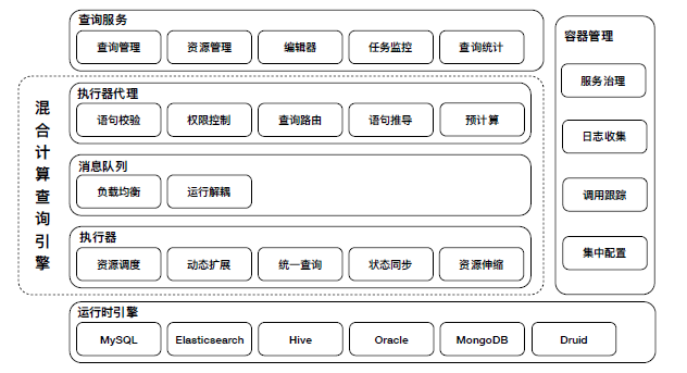 混合计算层主要分为两部分,一部分为执行器代理,主要对查询服务提供SDK,帮助外部服务理解SQL,并进行初步校验。另一部分为执行器,主要针对用户大批量的查询进行资源调度、统一解析、状态同步等。两部分由中间消息队列作衔接,达成负载均衡和双向解耦。