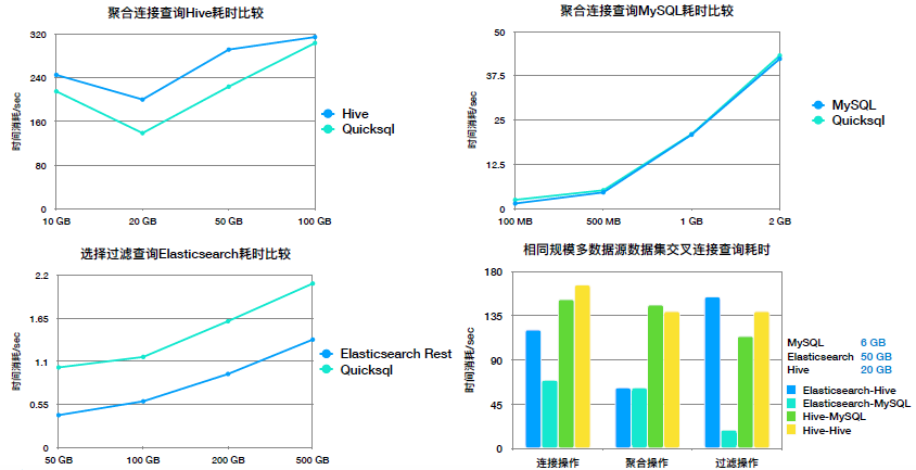 上面四张图展示了 QuickSQL 统一查询的性能比较,由于 QuickSQL 会牺牲一次解析的时间辅助查询,所以在 MySQL 和 Elasticsearch 的查询中会慢 0.5 s,在 Hive 查询中由于底层使用了 Spark-Hive 作引擎,因此性能会稍优于 Hive 原生查询。