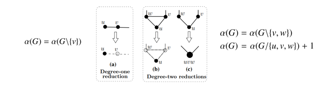 本文作者介绍了两种约化规则,通过这两种规则,可以快速删去原图中度数较小的一些顶点以及其相邻的边,在简化问题规模的同时,还确保了原图和新图最大独立集的一致性。作者将这两种约化规则称为度数一约化(degree-one reduction)和度数二约化(degree-two reduction)。