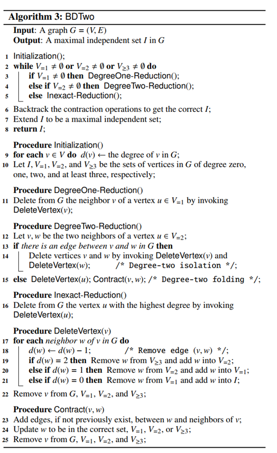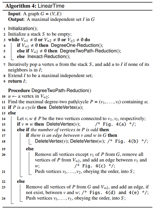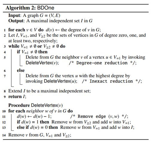这是本文四种算法的框架,主要思想为通过约化缩小问题规模,当没有约化规则适用时,则直接删去度数最大的节点(基于观察c)。最终得到一个只有孤立点的图,其中点构成了原图的一个独立集。框架的伪代码如下所示: