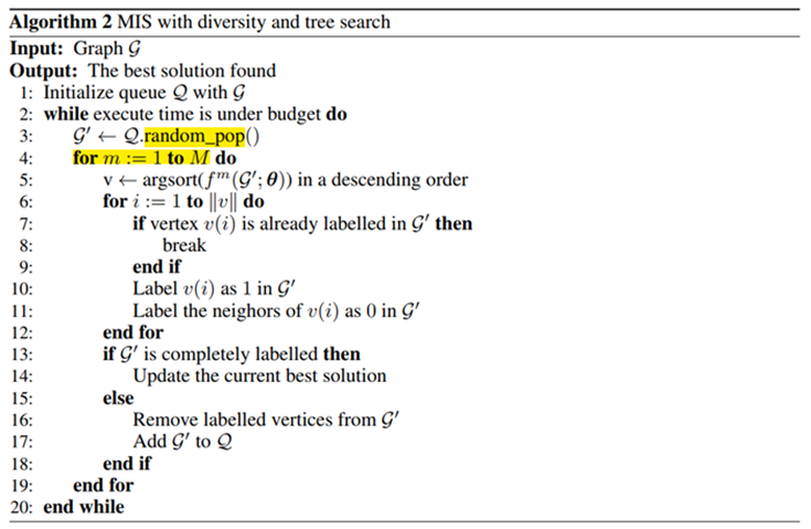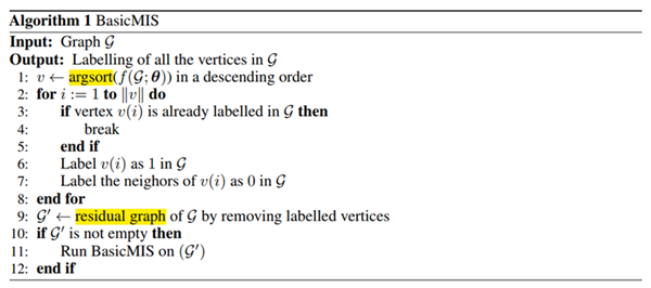 为解决这个问题,作者提出了将图中各点按照网络输出值从大到小排序,取值较大代表该点更有可能出现在MIS的解中,由此逐步构造一个独立集,伪代码如下所示: