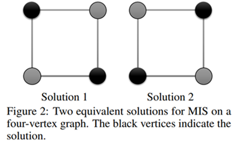 前面提到的基础算法仍有一些细节上没有解决的问题,例如,怎么区别同一图中的多个MIS解?比如下面的图示中,任意对角的两点都构成MIS,网络给出的输出可能四个点值都是相同的: