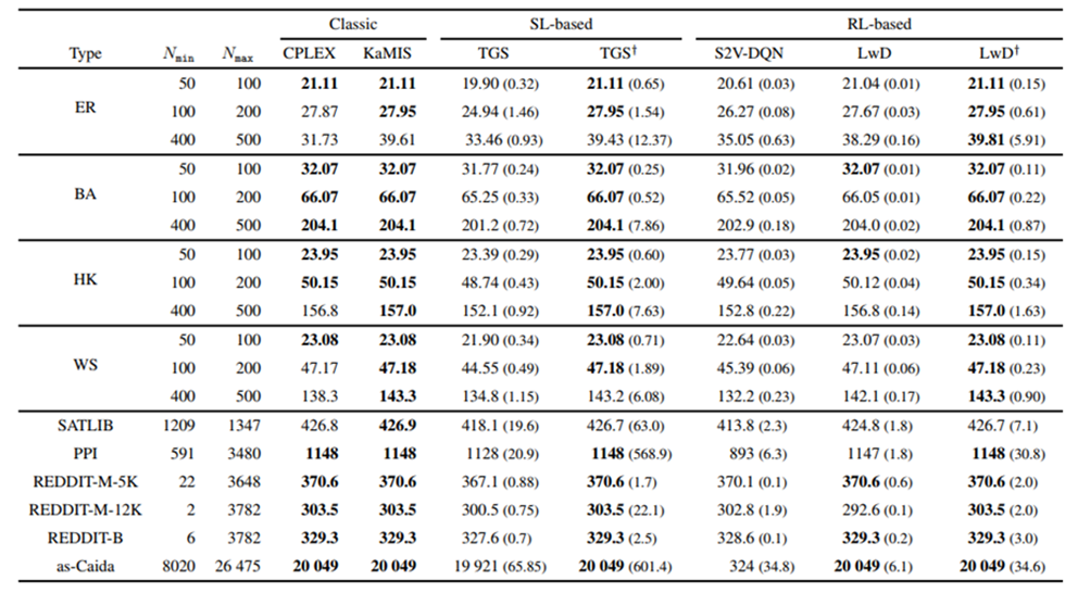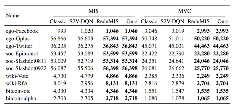 作者对比了不同方法求解MIS和MVC问题的效果和时间(时间比较可查看原文),发现本文提出的方法在选定的数据集上都取得了最好的效果(注意MVC解集越小越好):