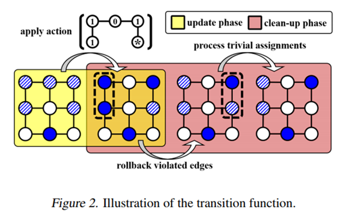 代表当前步骤状态未定的节点集。状态更新包含两步:update和clean up。update直接将状态未定的节点赋状态为行动值,clean up主要包含三类操作:(1)将某些只和状态0节点相连的节点的状态置为1。(2)回退两个状态为1且相邻的节点的状态为*。(3)将某些与状态1节点相连的节点的状态置为0。下面的状态图展示了如上的更新步骤:
