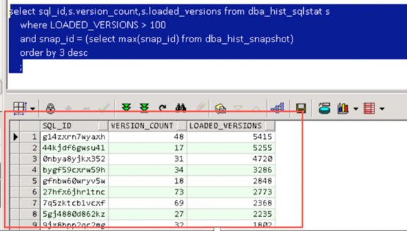 在数据库中可以看出大量loaded_version超过1000的SQL语句,并且其中有大量游标是过期的。其中SQL_ID:g14zxrn7wyaxh就是此次library cache lock等待最为严重的SQL。