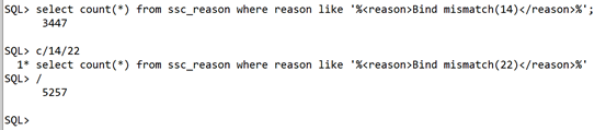 造成游标不能被共享的原因中有5257个游标的原因是Bind Mismatch(22),也就是绑定变量的字符长度发生变化,从32位升级到128位。