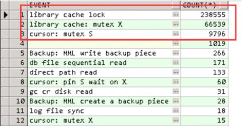 从22:00开始,数据库的活动会话飙升,每秒活动会话飙升至1000以上。故障时间段内的TOP EVENT主要表现在library cache lock和library cache: mutex X等待上。