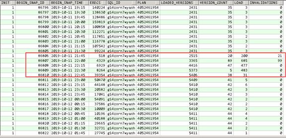 cache中,其中invalidations有120次,这是从DASH中取的数据,实际数值比采样还要大,另外SQL的LOADED_VERSION从原来的2431个在短时间内增长到5411个,实际的version