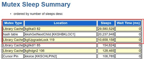 查看AWR中的Mutex Sleep信息发现:Mutex主要有三个函数的sleep是非常高的,kgllkal3 82、kkshGetNextChild[KKSHBKLOC1]、kglUpgradeLock 119。