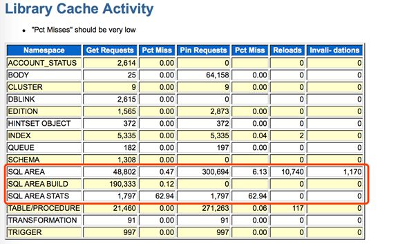 从AWR中可以看出SQL AREA BUILD被请求次数是最多的,这跟ASH中大量library cache lock是吻合的,SQL AREA中cursro reloads次数也达到10740次。Invali_dations达到1170次,说明有很多cursor失效了。