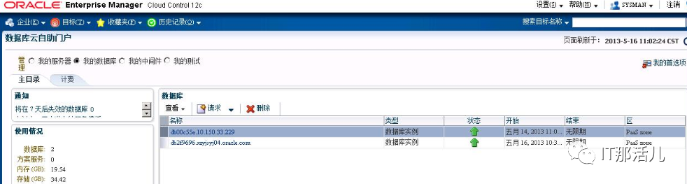 之前创建的PaaS区中有2台主机,而一次请求只创建一个数据库实例,所以这里我发出2次请求。首先EM12c会在这2台主机随机安装一个数据库实例,然后在其他主机上安装,不会重复安装,直到所有主机上的实例数相同时。