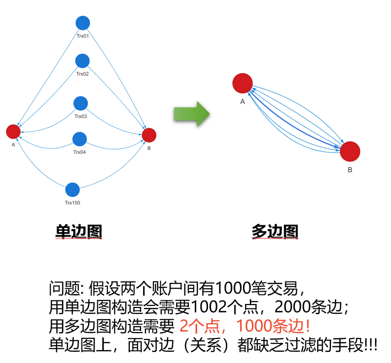 多边图,英文称为Multi-graph。任意两个顶点间可以存在多条边的情况为多边图。要更自然的表达真实的世界,显然是需要多边图的。否则的话,就需要制造大量的实体和没有太多意义的关联边来构图。单边图的构图会有数倍于多边图构图所消耗的顶点与边,并且效率低下。