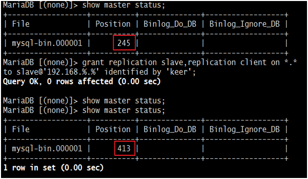 MariaDB [(none)]> grantreplicationslave,replicationclienton *.* toslave@'192.168.%.%' identifiedby 'keer';