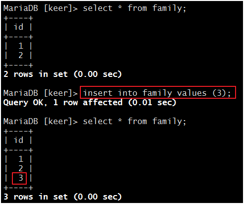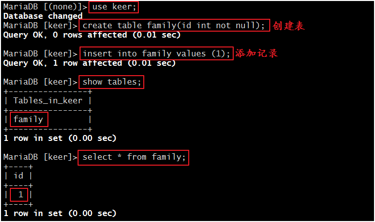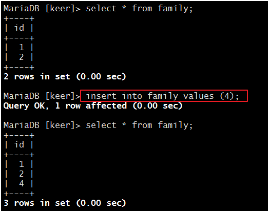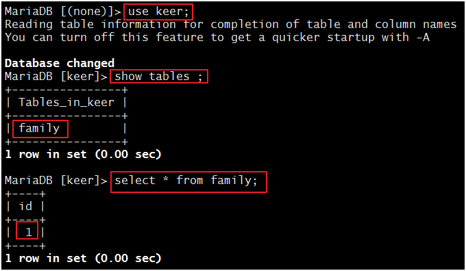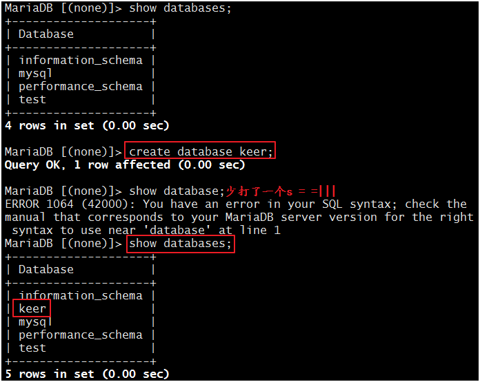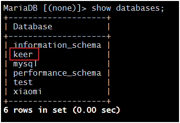 现在,我们在主服务器上创建一个数据库“keer”: