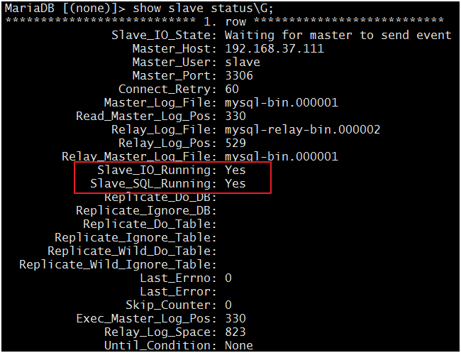 MariaDB [(none)]> change master to master_host='192.168.37.111',