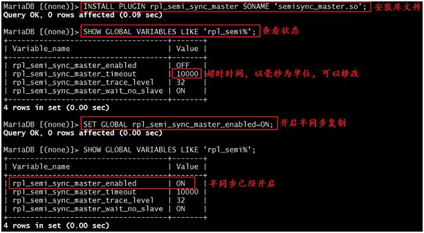 1. MariaDB [(none)]>INSTALL PLUGIN rpl_semi_sync_master SONAME 'semisync_master.so';