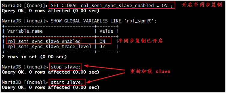 3. MariaDB [(none)]> SETGLOBAL rpl_semi_sync_slave_enabled = ON ;