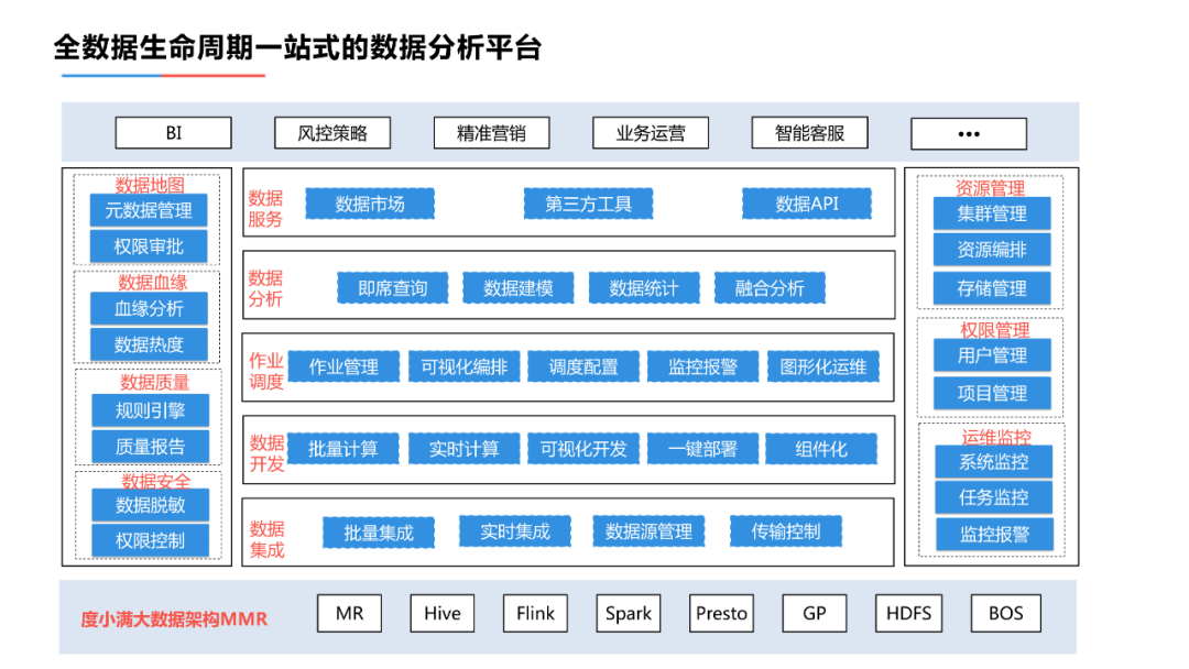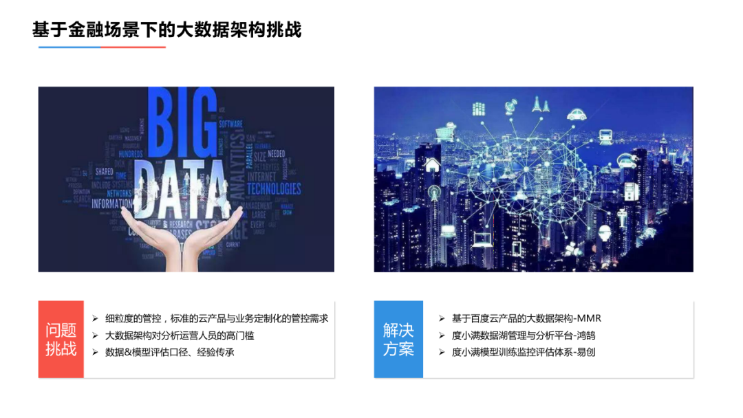 本文主要针对上述问题分享对应的解决方案,分别是:① 基于百度云产品的大数据架构——MMR,管控需求;② 度小满数据湖管理与分析平台——鸿鹄,降门槛;③ 度小满模型训练监控评估体系——易创,经验传承。