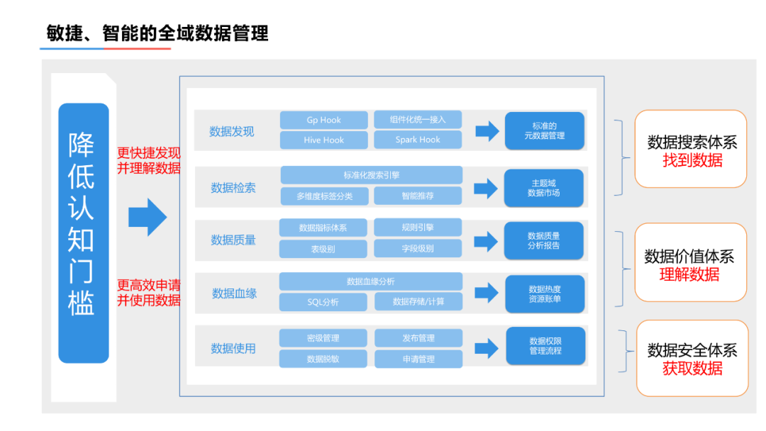 权限管控,脱敏以及加密管理,确保的数据流通过程中的数据安全;发布与申请流程管控,确保了数据按照业务需求分享与使用。