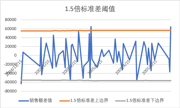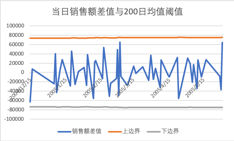 在Excel中处理还有一个好处是快速绘制销售额差值同上下边界的在时间维度上的折线图,直观的观察数据异常,如下图。