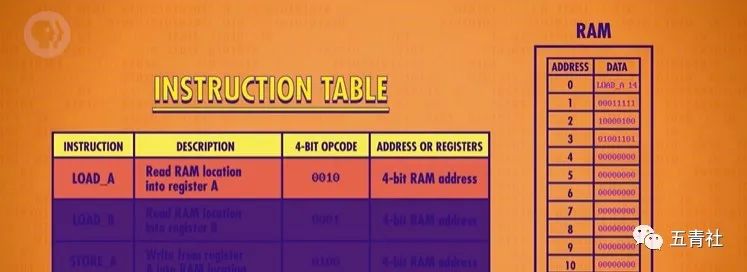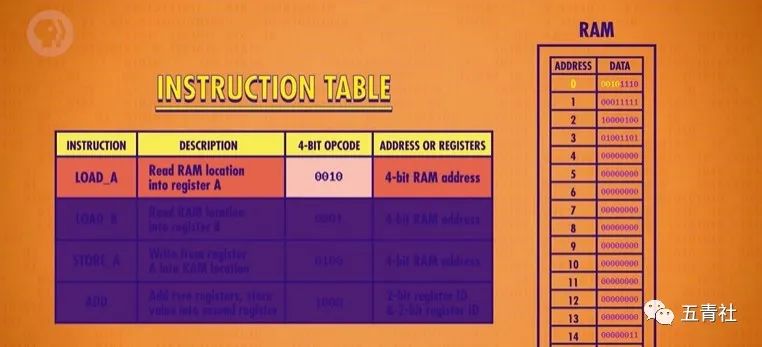 内存地址0是00101110,前4位代表LOAD_A,意思是:把后4位指定的内存地址的值,放入寄存器A,后4位是1110,十进制的14,我们来把00101110看成“LOAD_A 14”指令,这样更好理解!