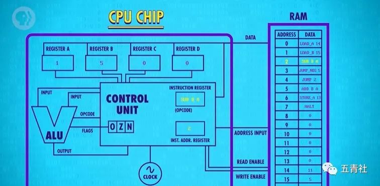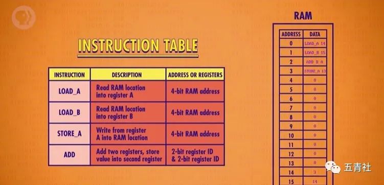 这里,我们的程序只有4个指令,还有数字3和14,现在一步一步看,“LOAD_A 14”是从地址14中拿到数字3,放入寄存器A;“LOAD_B 15”是从地址15中拿到数字14,放入寄存器B;“ADD B A”告诉ALU把寄存器B和寄存器A里的数字加起来,B和A的顺序很重要,因为结果会存在第二个寄存器,也就是寄存器A ,最后一条指令是“STORE_A 13”把寄存器A的值存入内存地址 13。