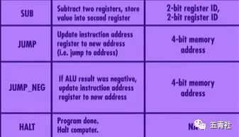 “SUB”是减法指令;JUMP是跳转指令,让程序跳转到新位置,如果想改变指令顺序,或者跳过一些指令,这个很实用,举例,JUMP 0可以跳回开头,JUMP在底层的实现方式是把指令后4位代表的内存地址的值,覆盖掉“指令地址寄存器”里的值;还有一个特别版的JUMP叫JUMP_NEGATIVE,它只在ALU的“负数标志”为真时,进行JUMP,算数结果为负,“负数标志”才是真,结果不是负数时,“负数标志”为假,如果是假,JUMP_NEGATIVE就不会执行,程序照常进行。