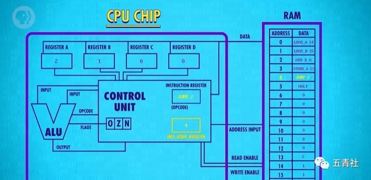 如上图所示,我们已经执行完前4个指令,该进行第5个指令JUMP,遇到JUMP,CPU会把“指令地址寄存器”的值,现在是4,改成2,就会执行地址2“ADD B A”,所以寄存器A变成3,然后存入地址13,又碰到JUMP 2,又回到ADD B A,寄存器A变成4,然后存入地址13,每次循环都+1,不断地循环下去,永远不会碰到HALT,总会碰到JUMP,这叫无限循环。