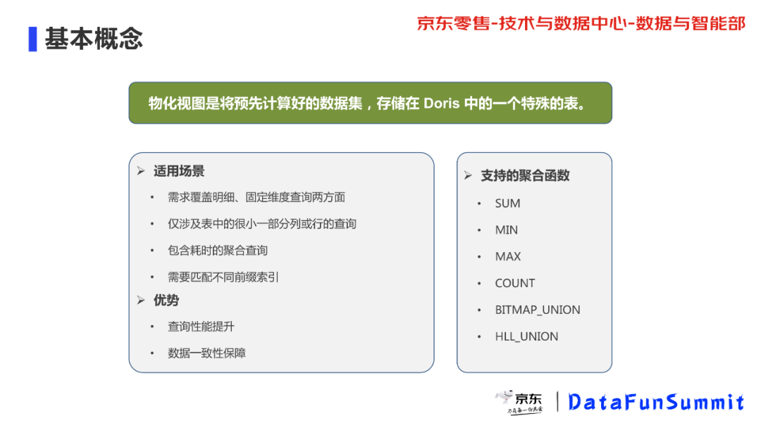 先介绍物化视图的基本概念,物化视图是指在 Doris 中将一些预计算好的数据存储在 Doris 中的一个特殊表(Doris 0.12版本之前是有 rollup 的概念,0.12 版本之后已经统一使用物化视图),这里涉及到两个知识点: