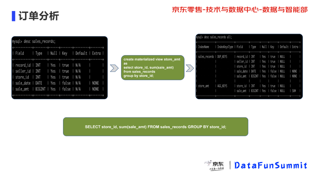 比如说我们做一个订单分析,假设我们左边那个表是一个订单表,有五个字段(订单ID、售卖员ID、仓储ID、售卖日期、售卖金额),然后我们创建一个对仓储ID分组、售卖金额求和的物化视图。物化视图创建完成后,我们可以通过 desc table_name all 的方式来查看,如图中所示我们可以看到已经新生成了有两列组成的 indexName :store_amt ,这就是我们刚刚创建的物化视图(通过这个命令查看把表和物化视图统一叫作 indexName)。