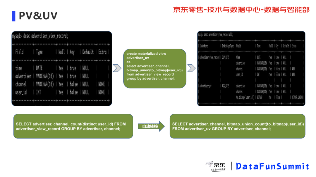 第二个场景就是典型的 PV/UV 场景,这在广告领域是很常见的。比如我们有一张广告记录表,有四个字段(时间,广告商,渠道,用户ID),然后我们创建一个可以创建一个根据广告和渠道分组,对 user_id 进行精确去重的物化视图,创建之后我们可以使用同样的方式查看。