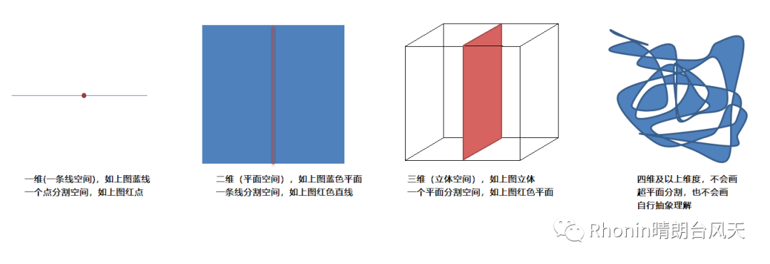 白话版:超平面就是在进行分类间隔,它的功能就是用来分割空间,为了让大家直观理解,我特地画了个图(亲手画的)。一维里是一个点分割空间,二维里是条线,三维刚好是个平面,四维的用几何已经无法表示了,但是我们赋予这个分割的东西为超平面,就比较形象了。超平面其实就是平面中的直线、立体中的平面之延伸。